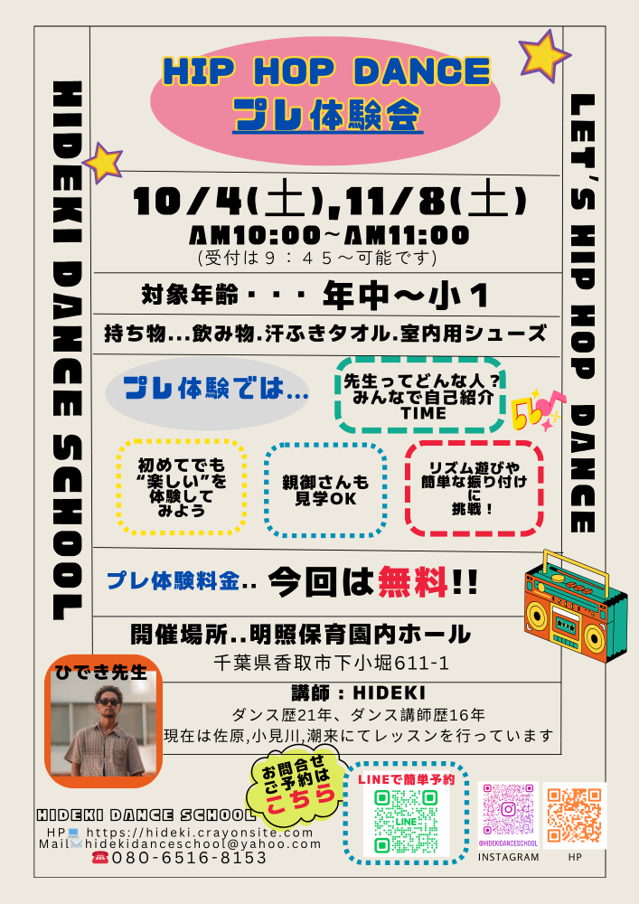 住所 | 小見川校: 明照保育園...千葉県香取市下小堀611-1 KMダンススクール...千葉県香取市小見川697−3 潮 来 校: 認定こども園 慈母学園...茨城県潮来市日の出4-7 佐 原 校: レヴェランス(ヨロズヤ米穀さん隣)...千葉県香取市佐原イ33860-1 |
